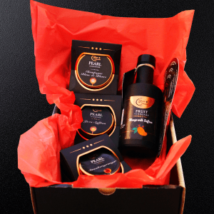 • 1 jar of Champagne Pearls – well, Champagne is love. It is fitting every season. Put a few of these unique pearls on a little caviar appetizer, on a fish tartare or carpaccio, or on top of a sorbet.