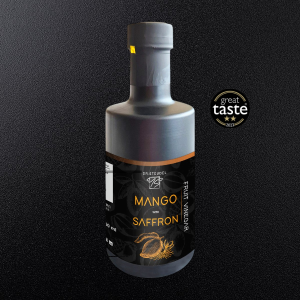 Safran verstärkt den Geschmack des Essigs und macht ihn komplexer und ausgewogener. Aber Safran spielt noch eine weitere Rolle – der schützt die Mango vor Oxidation und hält sie länger bunt und frisch.